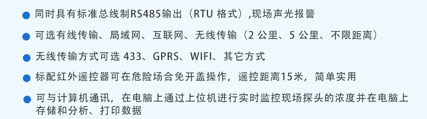 ①電纜傳輸:3芯、4芯電纜線,遠距離傳輸(1-2公里)②GPRS傳輸:可內置GPRS模塊,實時遠程傳輸數據,不受距離限制(選配)③無線傳輸:支持433Mhz,無線電臺傳輸模式,傳輸距離2-10Km,不同功率而定(選配) |