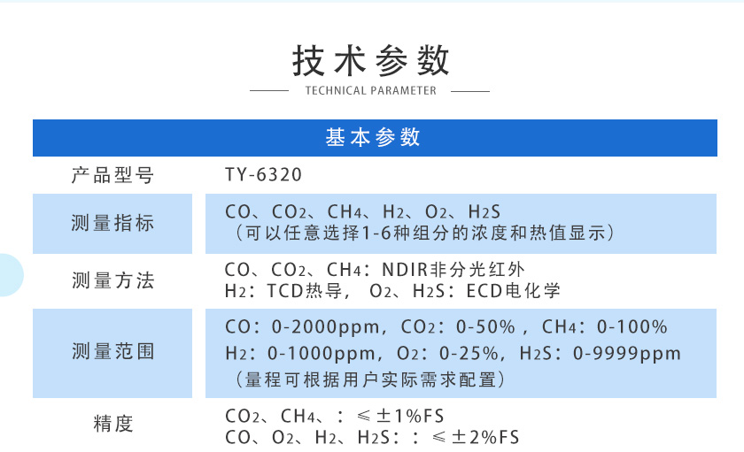 CO:0-2000ppm,CO2:0-50% ,CH4:0-100%,H2:0-1000ppm,O2:0-25%,H2S:0-9999ppm (量程可根據用戶實際需求配置) |