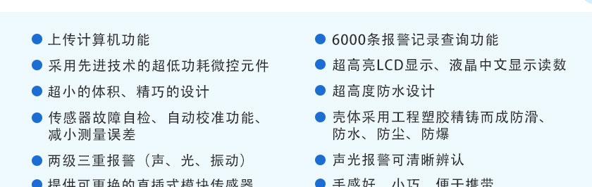 采用進口催化燃燒傳感器和微控制器技術,帶2.5寸高清彩屏實時顯示,無聲光+視覺報警,現場多種氣體濃度 24 小時連續在線監測及溫濕度的測量,適用于各種環境中的可燃氣體濃度檢測,響應速度快,測量精度高,穩定性和重復性好,整機性能居國內領先水平。儀器具有多種超強的電路保護功能,可防止錯接電源、反接電源、電源短路、電源不穩、電源與信號錯解等,導致的儀器損壞。