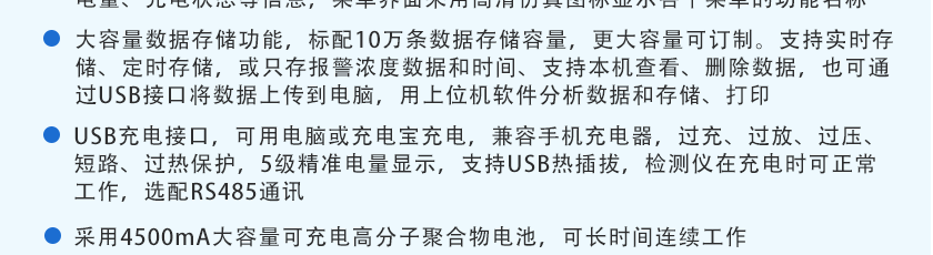 采用進口催化燃燒傳感器和微控制器技術,帶2.5寸高清彩屏實時顯示,無聲光+視覺報警,現場多種氣體濃度 24 小時連續在線監測及溫濕度的測量,適用于各種環境中的可燃氣體濃度檢測,響應速度快,測量精度高,穩定性和重復性好,整機性能居國內領先水平。儀器具有多種超強的電路保護功能,可防止錯接電源、反接電源、電源短路、電源不穩、電源與信號錯解等,導致的儀器損壞。