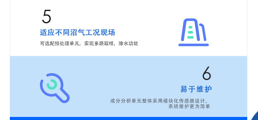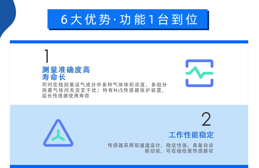 采用進(jìn)口NDIR非分光紅外傳感器,長壽命電化學(xué)傳感器,運用先進(jìn)的數(shù)字處理技術(shù),可同時測量沼氣中CH4、CO2、H2S、O2、CO、H2的體積濃度,根據(jù)氣體濃度值快速準(zhǔn)確計算出相應(yīng)的熱值。