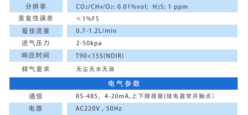 CO2/CH4:±2%FS; H2S/O2:±3%FS |