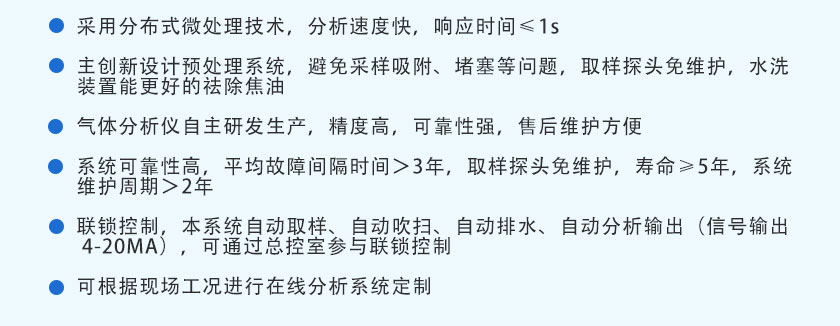 TY-8300型煤氣在線分析系統(tǒng)是天禹智控自主研發(fā)新型在線監(jiān)測系統(tǒng),該產(chǎn)品基于非分光紅外(NDIR)氣體分析技術(shù)、長壽命電化學(xué)傳感技術(shù)以及基于MEMS的熱導(dǎo)技術(shù),可同時(shí)在線測量煤氣的熱值,以及CO、CO2、CH4、H2、O2、CnHm等氣體的體積濃度。預(yù)處理系統(tǒng)采用冷干法設(shè)計(jì),關(guān)鍵部件采用原裝進(jìn)口,可根據(jù)現(xiàn)場不同的工況條件,為客戶定制解決方案,保證分析系統(tǒng)的可靠運(yùn)行。