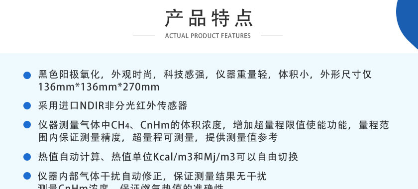 采用自主知識產權的NDIR非分光紅外技術,主要用于測量各種天然氣氣、生物燃氣中的CH4、CnHm?等氣體體積濃度及熱值。測量精度高、結構簡單、維護方便,軟件功能強大,可拓展性強、現場實用性好,目前暢銷國內外。適用于高校、環境科研機構,燃氣計量檢測部門、節能監測部門,液化氣廠、液化氣站、天然氣公司等直接用戶,燃氣具生產企業、廠商測量可燃氣體不同成分的體積濃度和熱值。